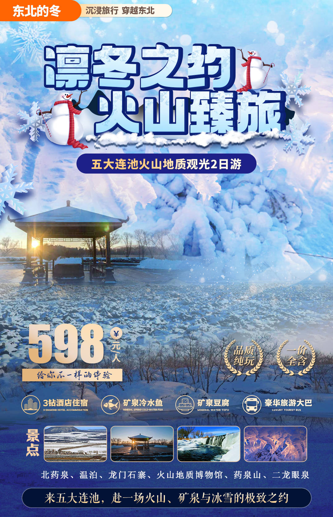 火山地质观光游线路以“深度体验+科学认知”为核心,精准匹配游客对自然奇观与特色文化的双重需求。行程规划上,采用“循序渐进”的节奏:抵达五大连池后,优先游览龙门石寨、白龙湖等视觉冲击力强的火山地貌,让游客快速沉浸于独特地质环境;次日聚焦“名泉体验+科学探索”,先在北药泉品味世界名泉的独特口味,再通过温泊的生态景观过渡,最后在火山地质博物馆系统学习地质演化知识,形成“感官体验—文化感知—科学认知”的完整体验链。