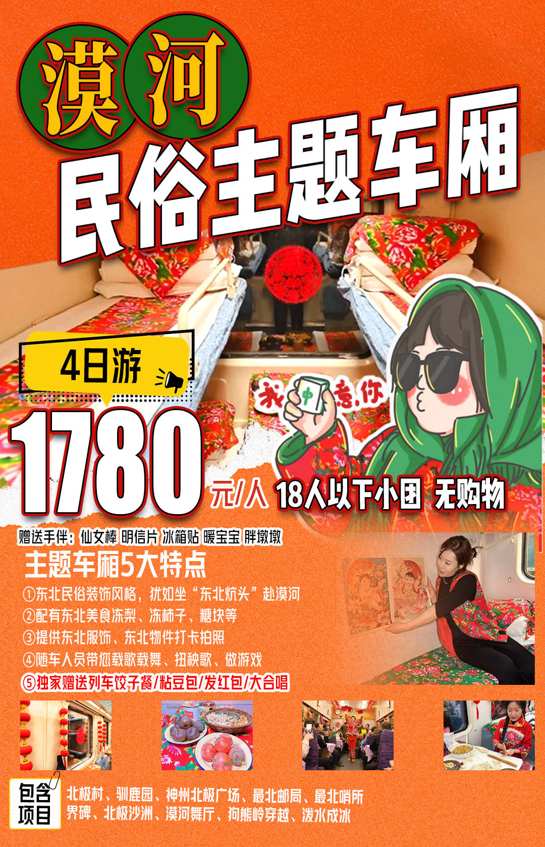 漠河民俗主题车厢4日游 ,是我司联合哈尔滨铁路局打造的首列东北民俗文化旅客列车车厢,“东北大花”“东北炕头”、传统年画等东北民俗文化氛围扑面而来。为了游客深刻体验到,丰富内涵,增强互动,车厢内部围绕东北农家乐主题,装饰了“最北人家”“喜迎丰收”“跨年狂欢”等多个带有互动演绎的沉浸式场景。“欣赏北国风光的同时,还能感受生动的地方文化,真是不虚此行。”在火车上欣赏了剪窗花和大秧歌等东北民俗表演,还试吃了冻梨、冻柿子等东北“冻货”,仿佛真的到了东北农家的热炕头。漠河当地都是18人小团,精品民宿,没有任何购物店,北极村、圣诞村、驯鹿园、五六火灾纪念馆等精华景点全部包含。